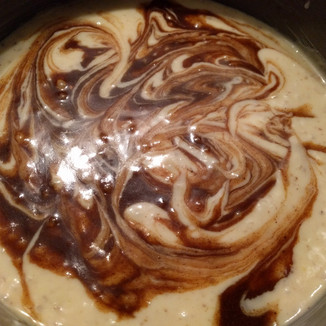 8: Pour the Cinnamon Swirl mixture over the top of the Cake mix. Then swirl the Cinnamon mix in, I did this with the end of a spoon. Next time I would make it a little more even across the whole cake though as mine was pooled in the middle.